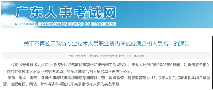 近日,廣東人事考試網發布《關于不再公示我省專業技術人員職業資格考試成績合格人員名單的通告》。
